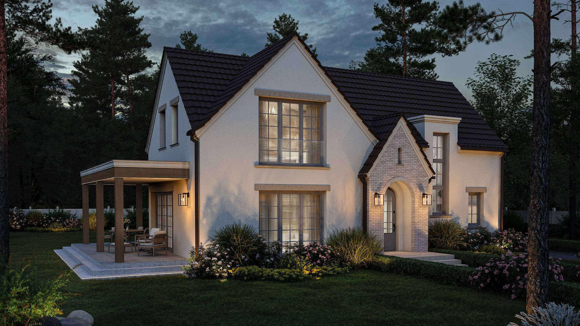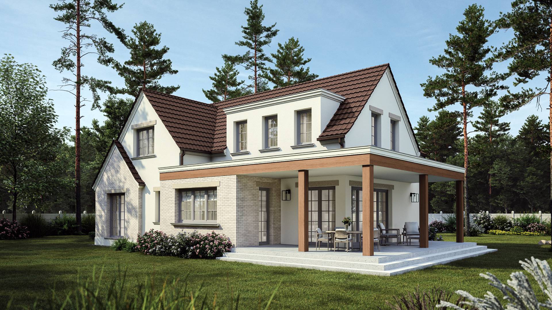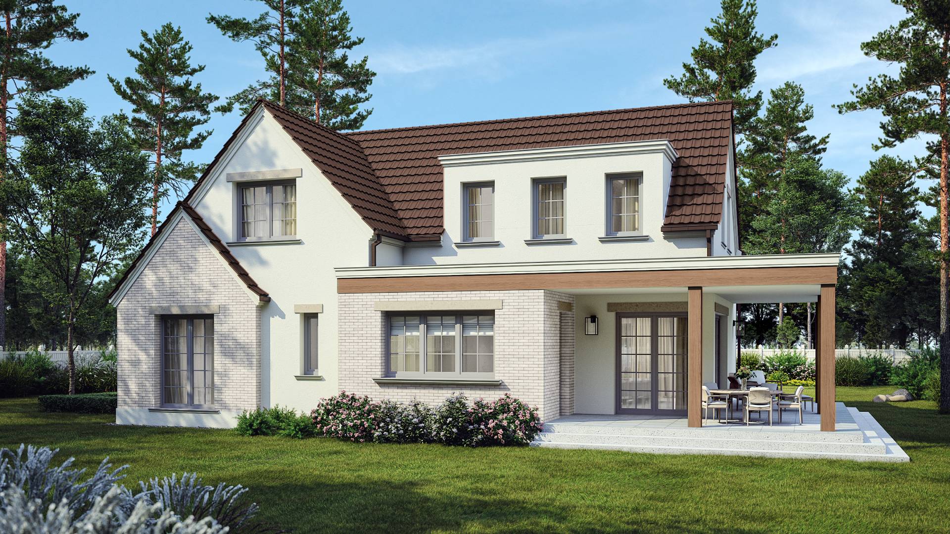 The project stands out for its use of classic chocolate-colored roofing tiles, which blend beautifully with the wooden terrace and handcrafted clinker tiles in beige tones. The remaining facades are finished with high-quality, finely textured mineral plaster. For this elevation, we chose an earthy color palette, and it was a perfect choice! The color composition is stunning and ensures that the building blends seamlessly into its surroundings while maintaining its unique and distinctive character.