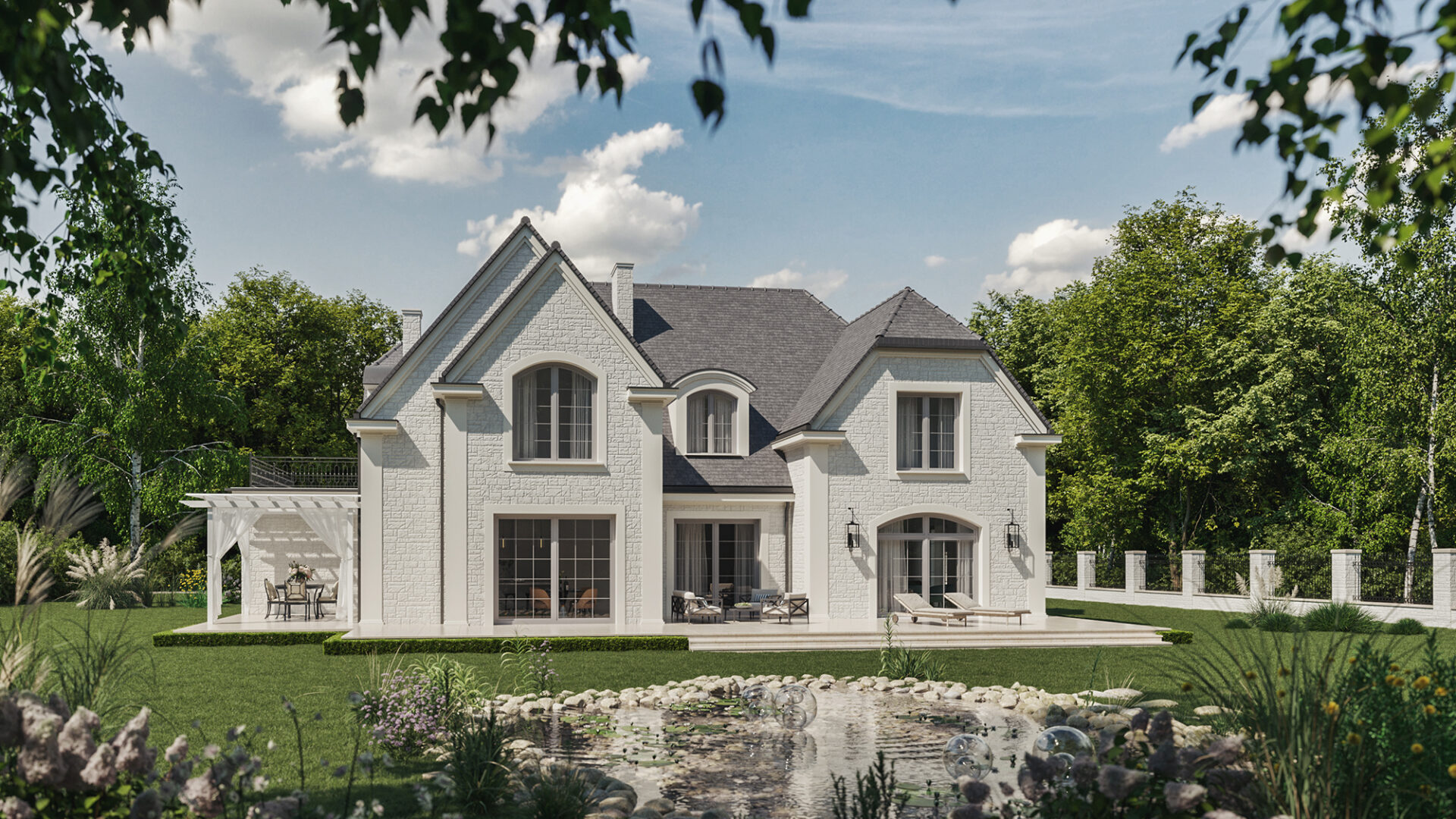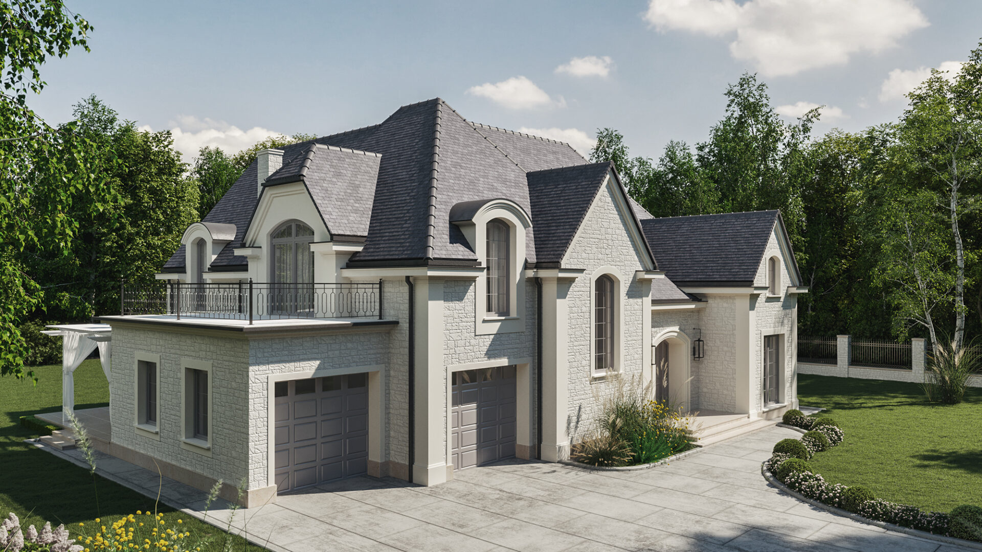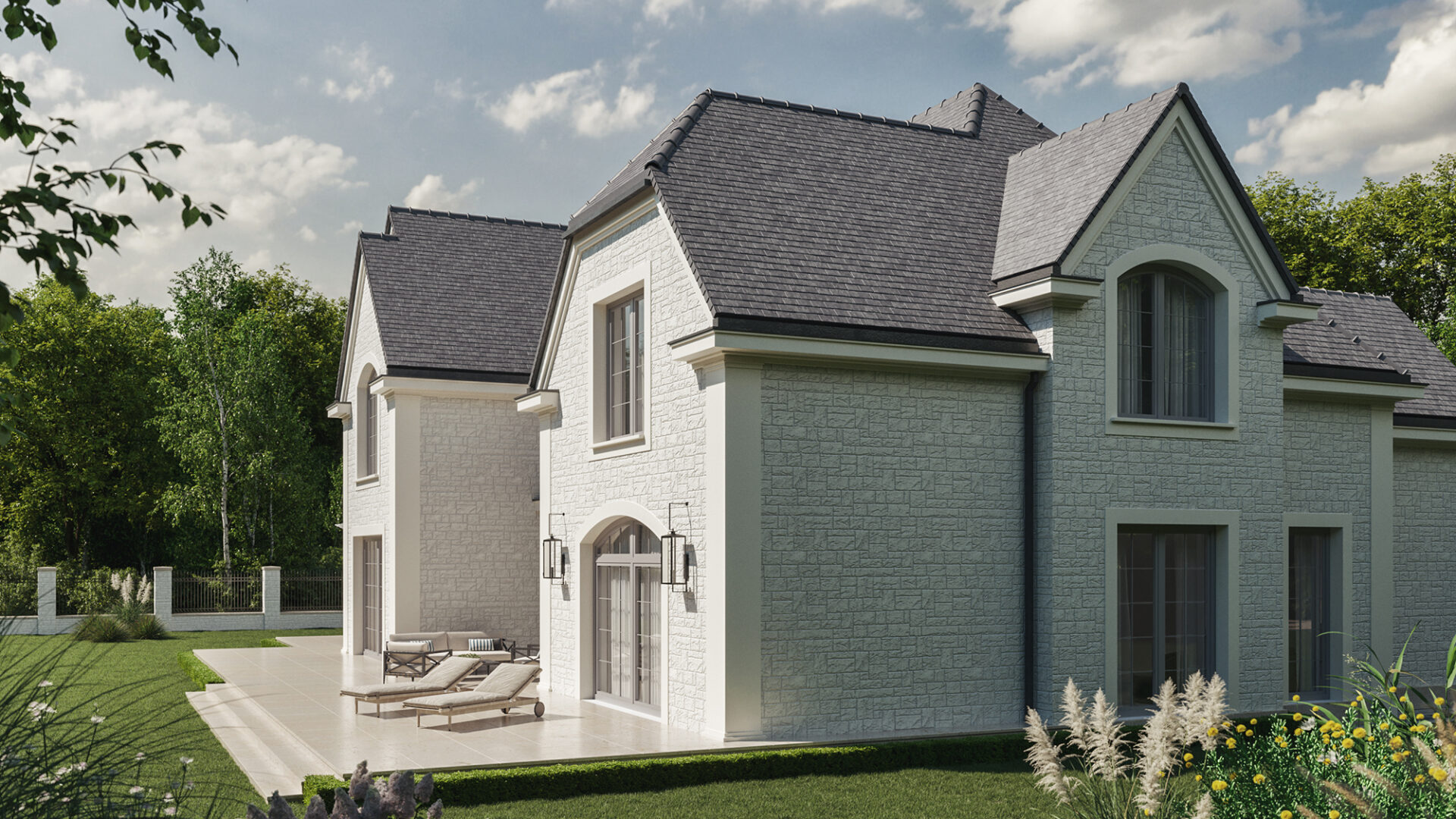 Klasyczna rezydencja Admirable [admirabl] to ekskluzywny projekt katalogowy, którego szlachetność podkreślają kremowa elewacja, wykonana z kamienia naturalnego, oraz antracytowy dach pokryty francuską dachówką imitującą łupek.