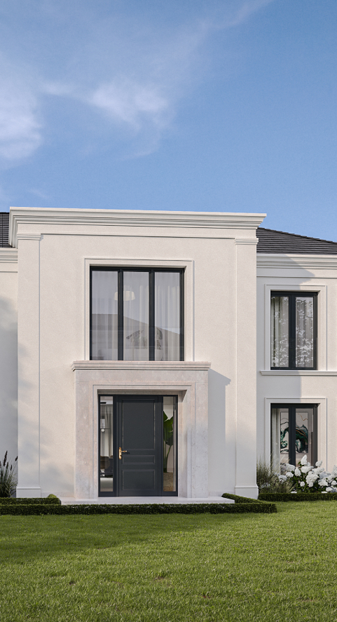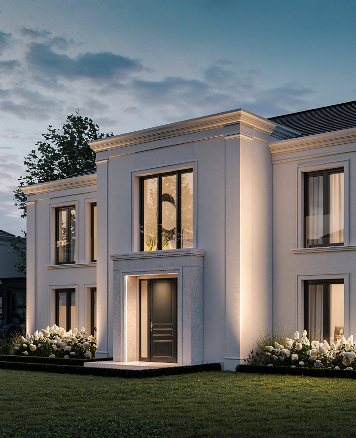 Dach o kącie nachylenia 30 stopni został zaprojektowany jako wykończony ekskluzywną ceramiką francuską, w kolorze grafitu. Jasna elewacja z tynku mineralnego posiada minimalistyczne sztukaterie, delikatnie podkreślające klasyczną estetykę bryły. Przy wejściu głównym zrezygnowaliśmy z typowego założenia kolumn i balkonu, na rzecz głębszego portalu drzwiowego, obłożonego spiekami kwarcowymi.